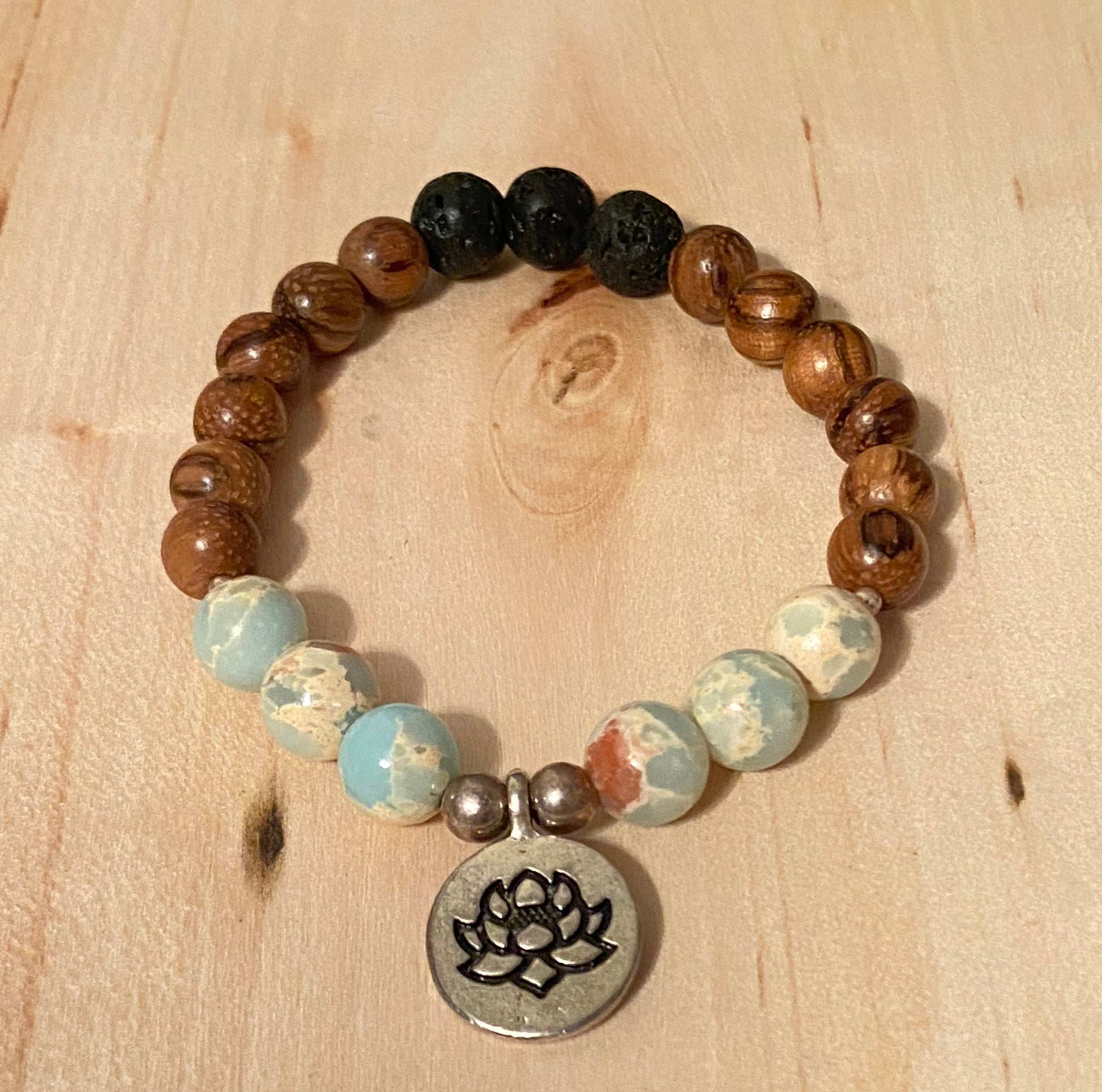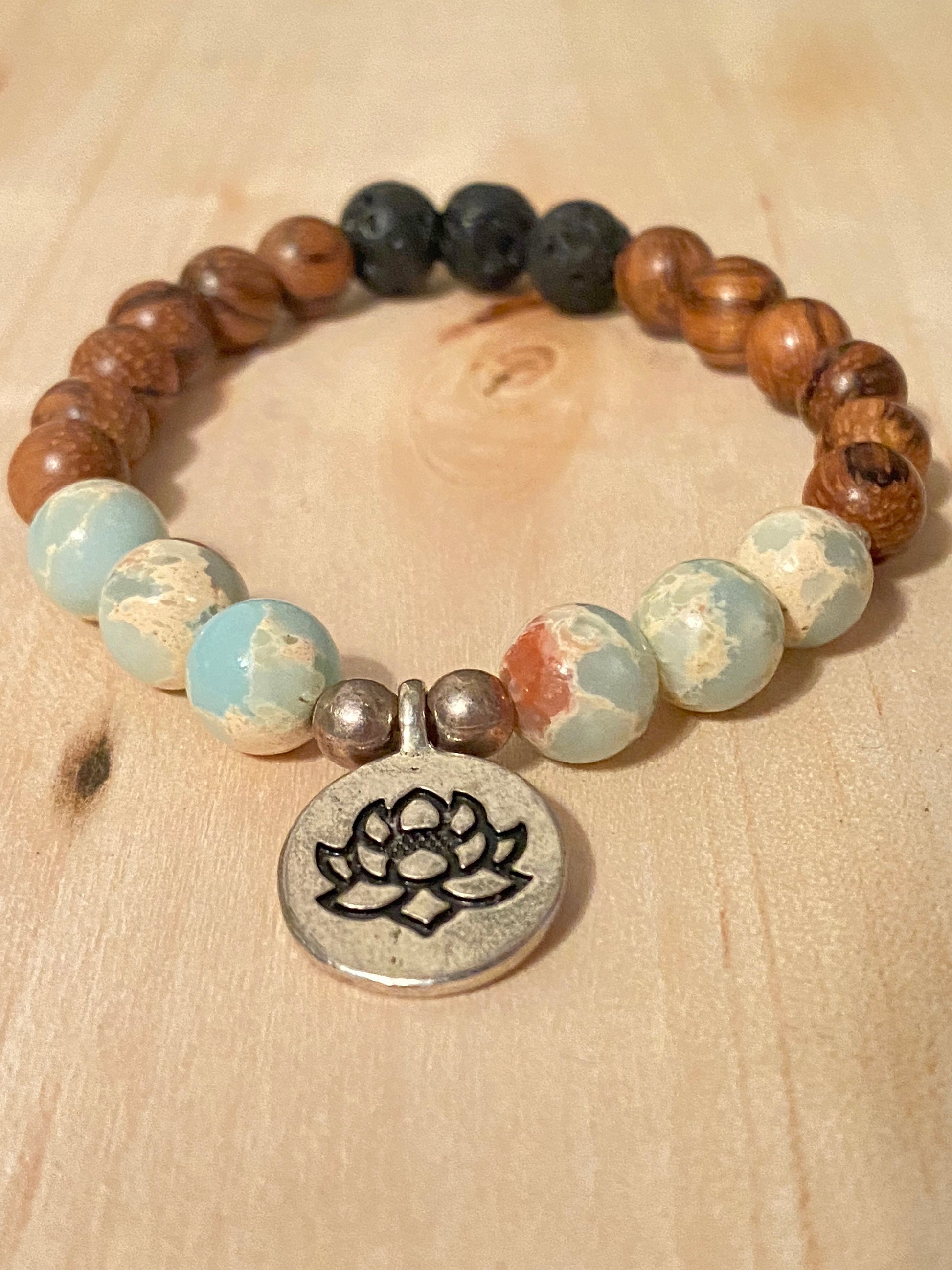 This is for 1 bracelet 8mm wood beads 8mm African Opal Jasper 8mm Lava Stone 2-6mm Sterling silver bead Lotus Charm (dime size) Elastic Diffuser Bracelet