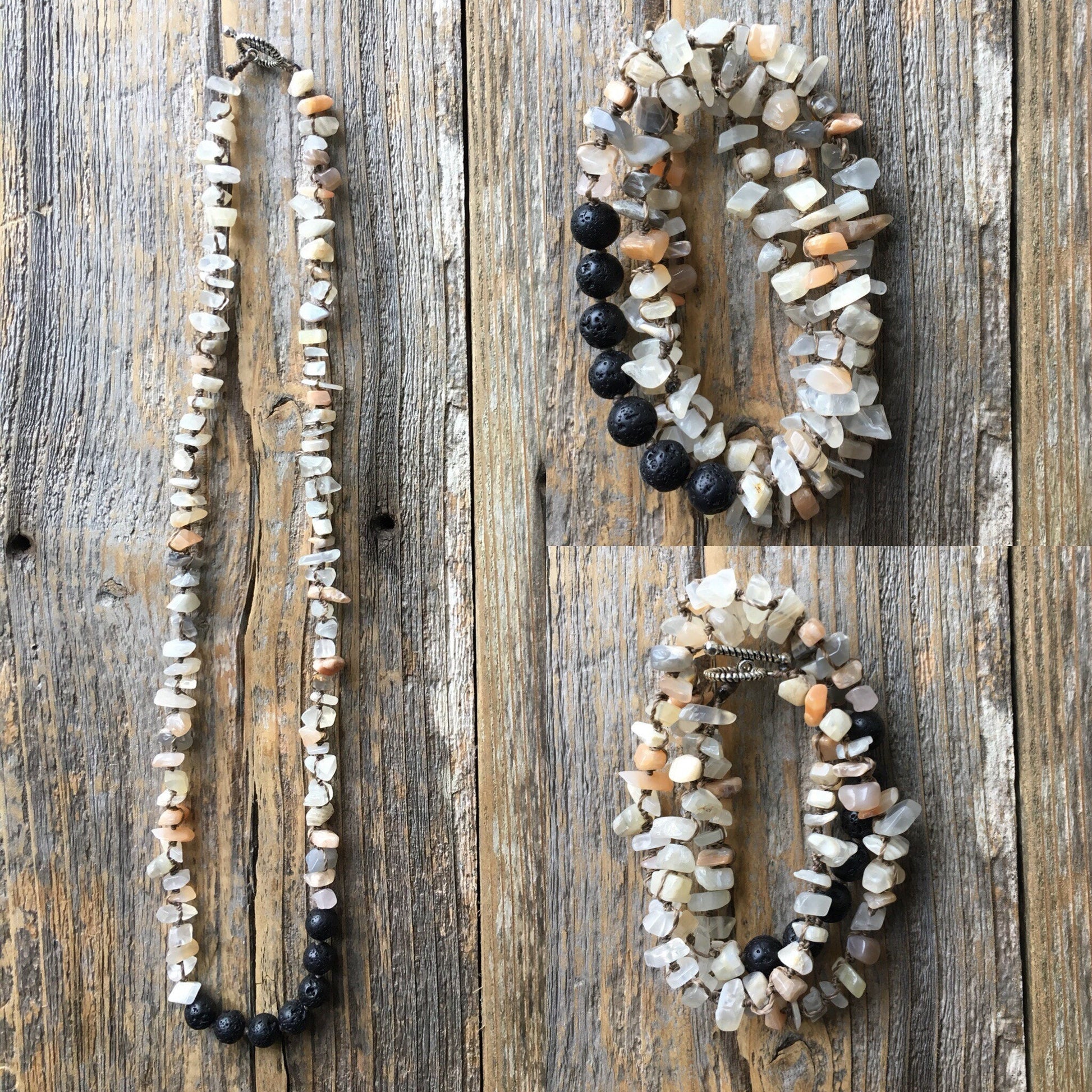 This piece is made of Moonstone chips that range in size from 5mm to 11mm and 7 Lava Stones that are about 8mm.